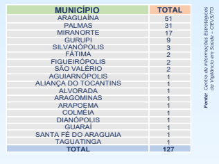 O boletim epidemiológico nº 322 também confirmou seis óbitos, ocorridos nos dias 26 e 27 de janeiro de 2021. Os pacientes eram residentes de Gurupi, Guaraí, Aguiarnópolis, Colméia e Santa Fé do Araguaia.